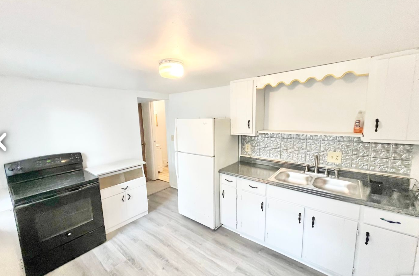 The kitchen is the quiet showstopper — a stainless double sink, full-size fridge, electric range, generous white cabinetry, and a charming pressed-tin backsplash that gives the space a little personality without trying too hard. There's real counter space for actual cooking and room to pull up a stool with your morning coffee.