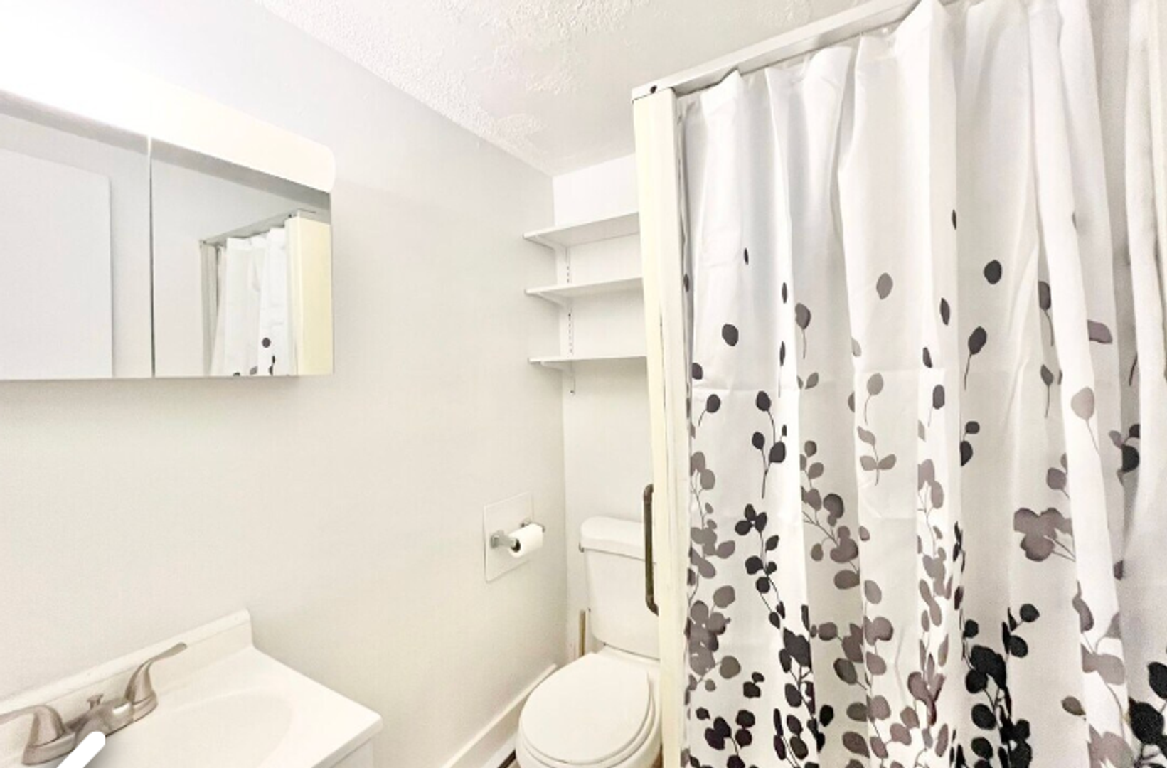 The living area is open and airy, with a bright window, fresh paint, and enough room to arrange things exactly the way you like. The bedroom is comfortable and private, and the updated bathroom features a clean tub-and-shower combo, mirrored medicine cabinet, and tidy built-in shelving for everything you need within reach.