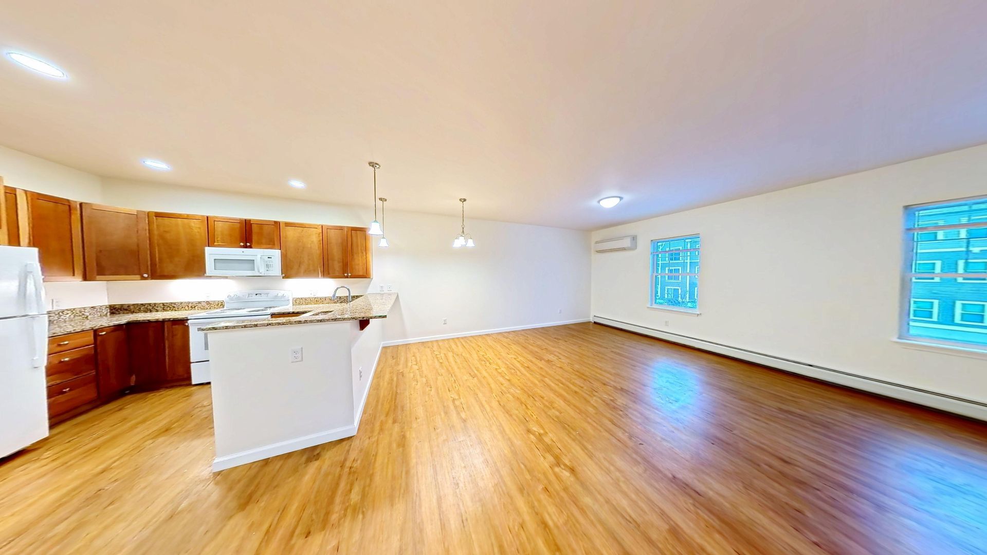 Inside, you’ll find 9-foot ceilings, hard-surface flooring, granite countertops, and soft-close cabinetry, paired with matching modern appliances including a dishwasher and built-in microwave. Energy-efficient heat pumps provide both heating and air conditioning, giving residents full control year-round. A washer and dryer are included in-unit for added convenience.