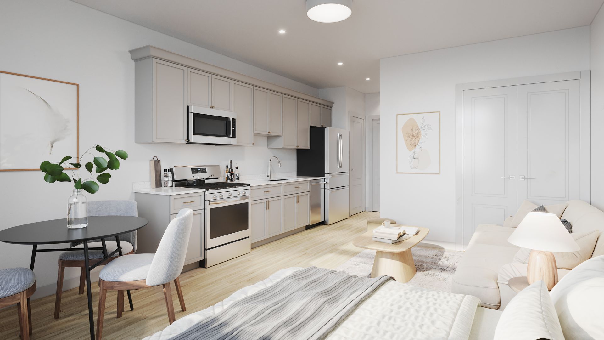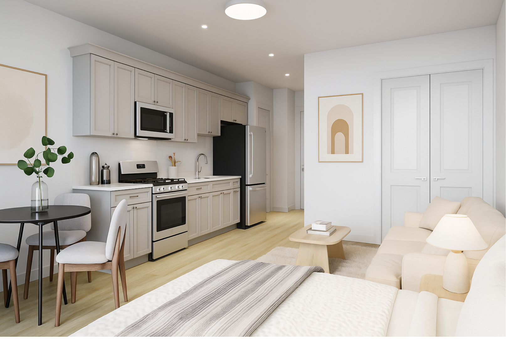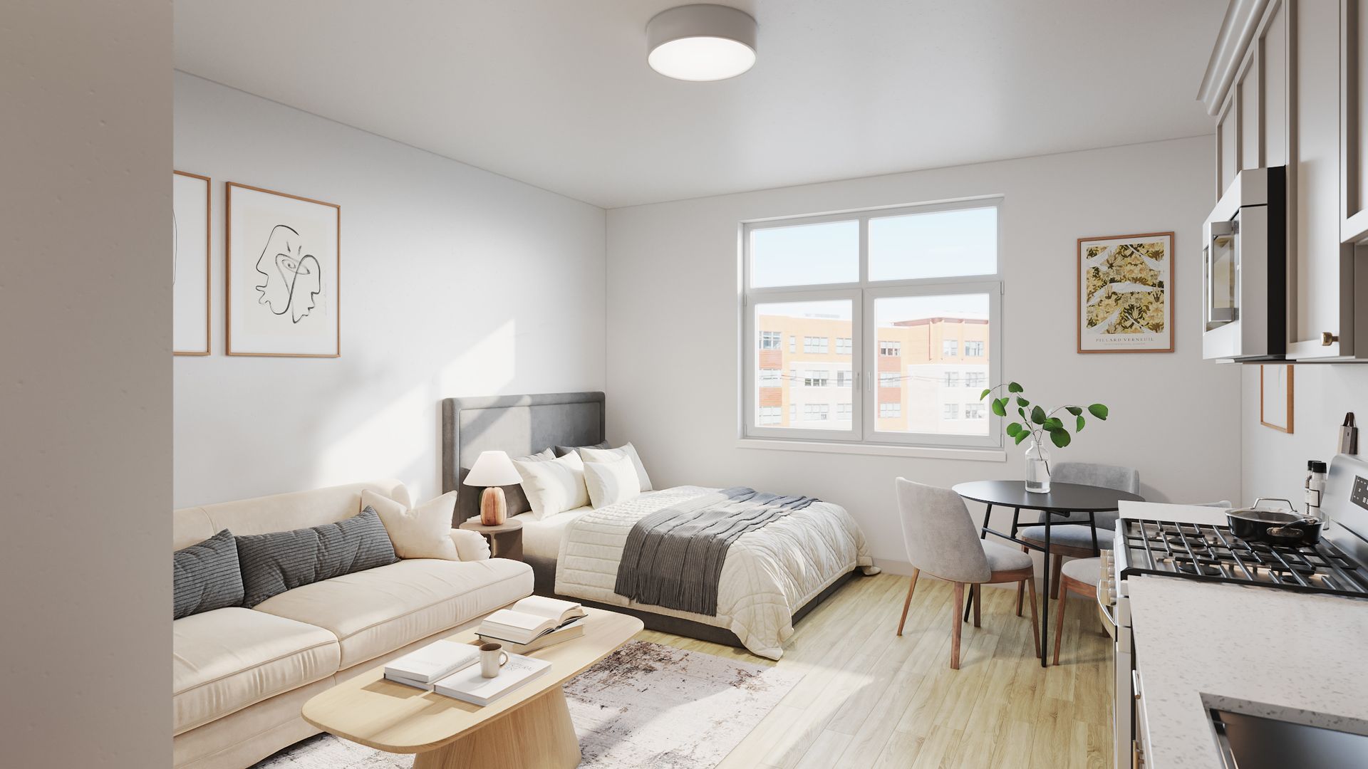This thoughtfully designed studio apartment offers a sleek, modern layout with stainless steel appliances, stone countertops, and contemporary lighting. The expansive windows bring in natural light and provide beautiful city views. Enjoy the convenience of in-unit laundry, interior air conditioning, and a fully equipped kitchen.