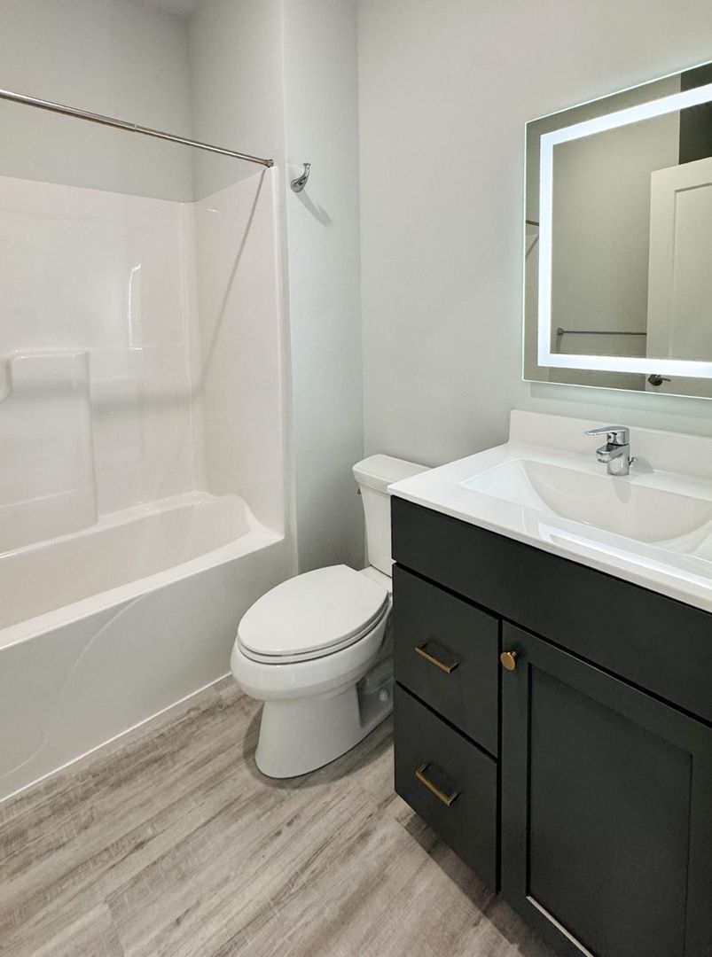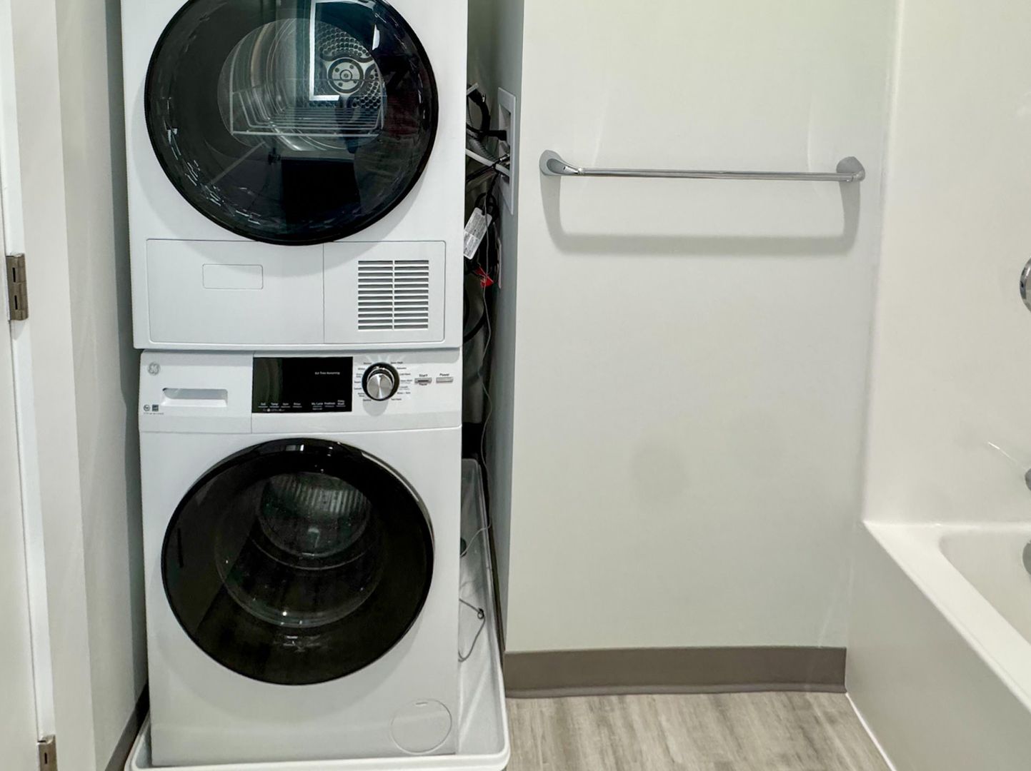 Hidden Convenience: A full-sized soaking tub anchors the bath, while a high-efficiency washer and dryer are tucked discreetly away to maintain the home's sleek aesthetic.