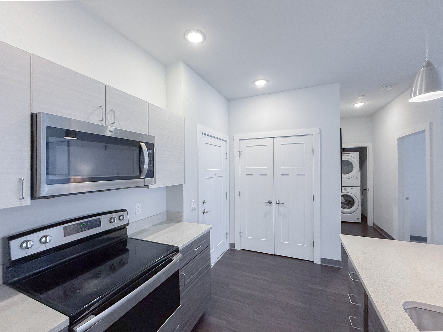 - Full kitchen with stainless steel appliances (stove, fridge, microwave, dishwasher)
