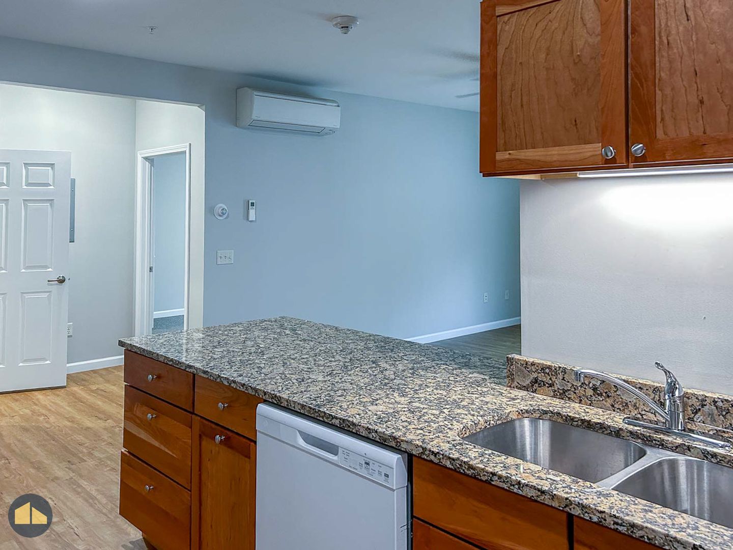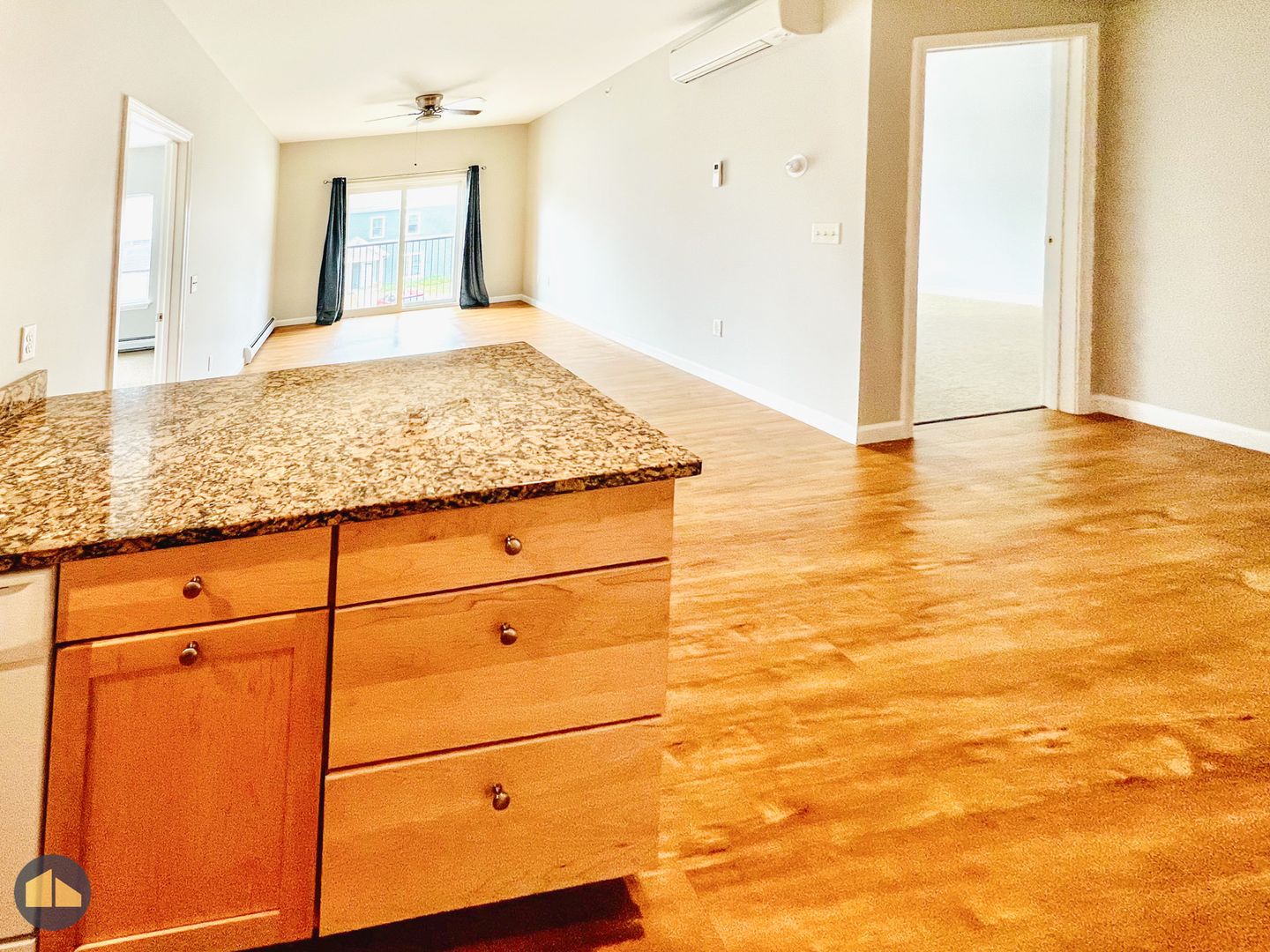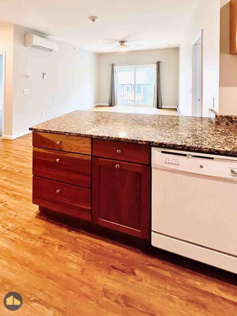2 bed, 2 bath apartment in newer build apartment building. Each apartment includes brand new, matching appliances — including a dishwasher — granite countertops, soft close cabinetry, and air conditioning via resident controlled, energy efficient heat pumps.