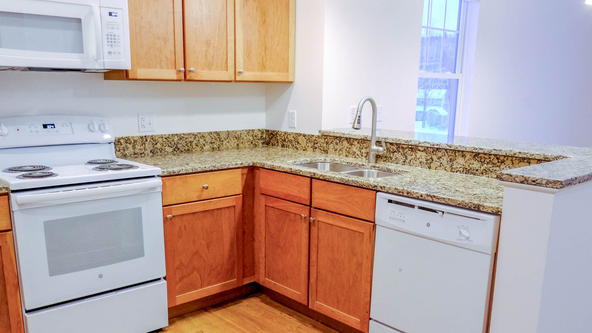 Inside, you’ll find 9-foot ceilings, hard-surface flooring, granite countertops, and soft-close cabinetry, paired with matching modern appliances including a dishwasher and built-in microwave. Energy-efficient heat pumps provide both heating and air conditioning, giving residents full control year-round. A washer and dryer are included in-unit for added convenience.