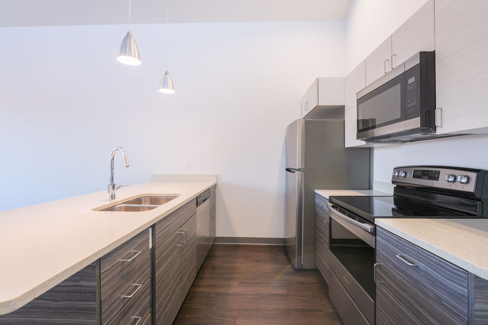 - Full kitchen with stainless steel appliances (stove, fridge, microwave, dishwasher)