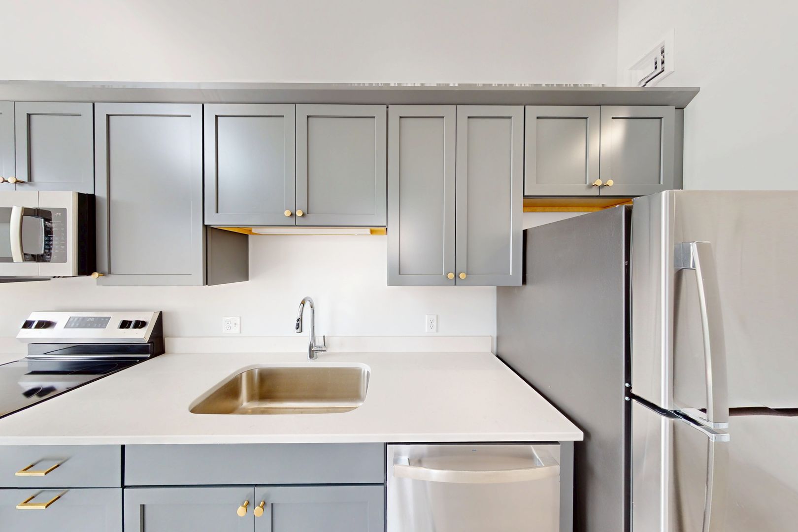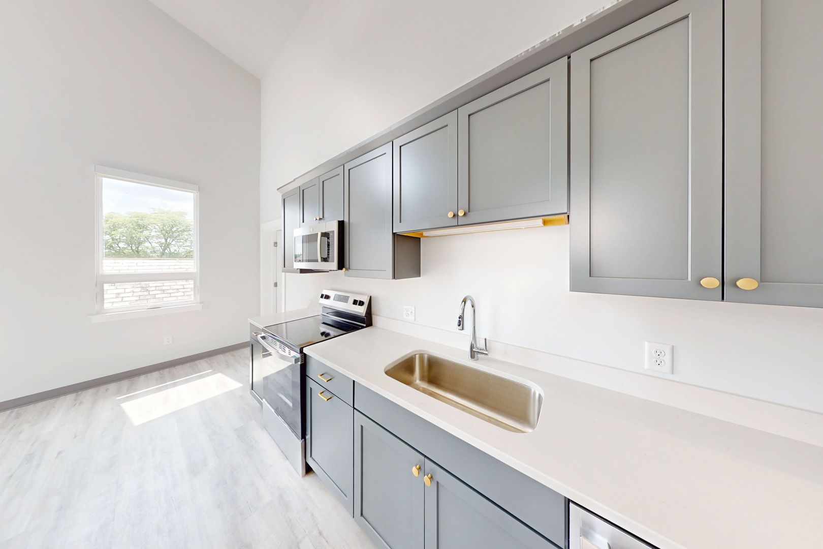 The open-concept main level seamlessly connects the kitchen, dining, and living areas, enhanced by expansive windows, natural light, and city views. The modern kitchen is thoughtfully designed with matching stainless steel appliances, stone countertops, an apron sink, and a built-in microwave, complemented by designer pendant lighting, recessed lighting, and hard-surface flooring throughout. An in-unit washer and dryer, energy-efficient heat pump, and air conditioning provide year-round comfort and convenience.