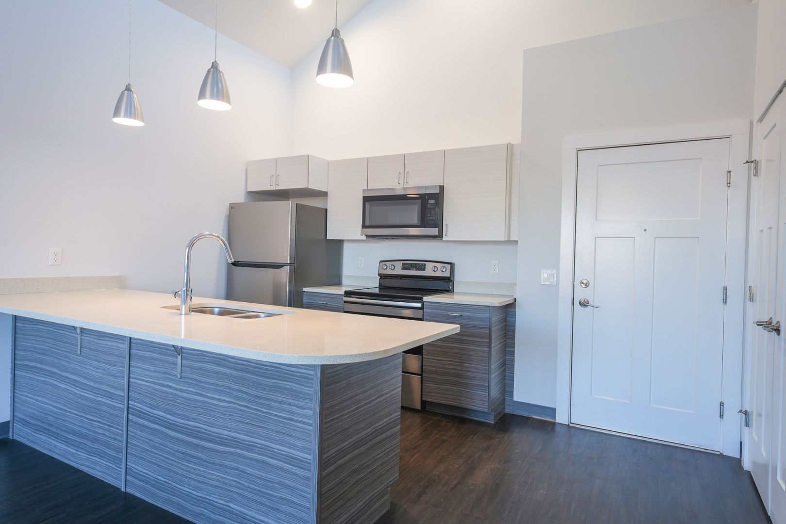 - Full kitchen with stainless steel appliances (stove, fridge, microwave, dishwasher)